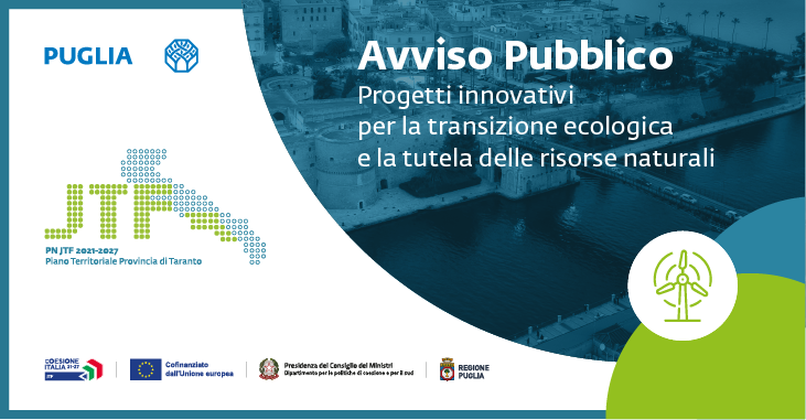 Il Programma Nazionale “JUST TRANSITION FUND” prevede nell’ambito della Priorità n. 2 “Sostegno alla Transizione della Provincia di Taranto” l’Azione 2.3 “Supporto ai progetti innovativi per sostenere la transizione ecologica e tutelare le risorse naturali”.